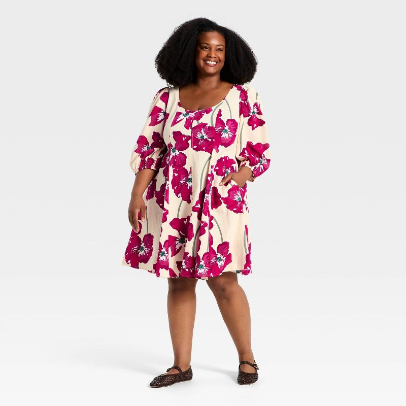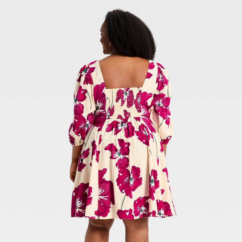 Women's Bishop 3/4 Sleeve Seamed Midi A-Line Dress - Ava & Viv™ Cream/Berry Floral XXL