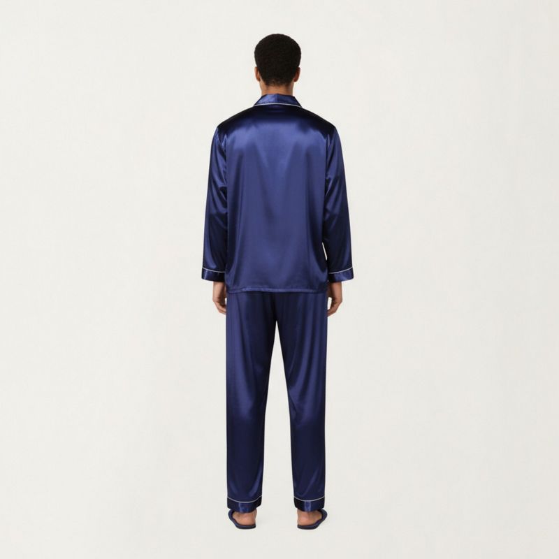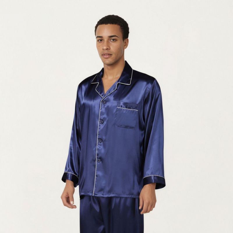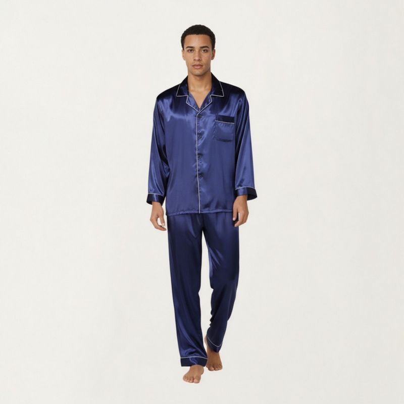 Anna-Kaci Men's 2-Piece Set Satin Pajamas with Contrast Piping and Button-Up Top - Medium, Navy