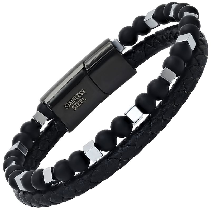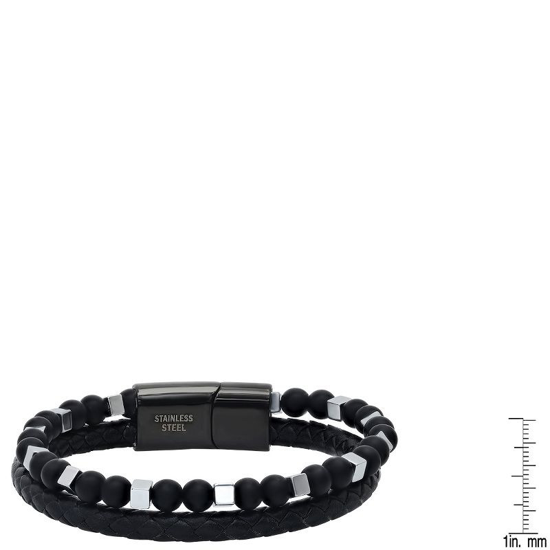 Steeltime Men's black braided leather/stainless steel and lava beaded double layered bracelet