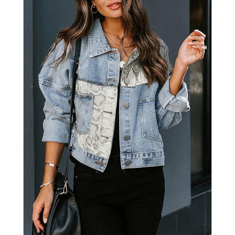 Womens Denim Jean Jacket Button Down Distressed Leopard Long Sleeve Pocketed Jean Coat