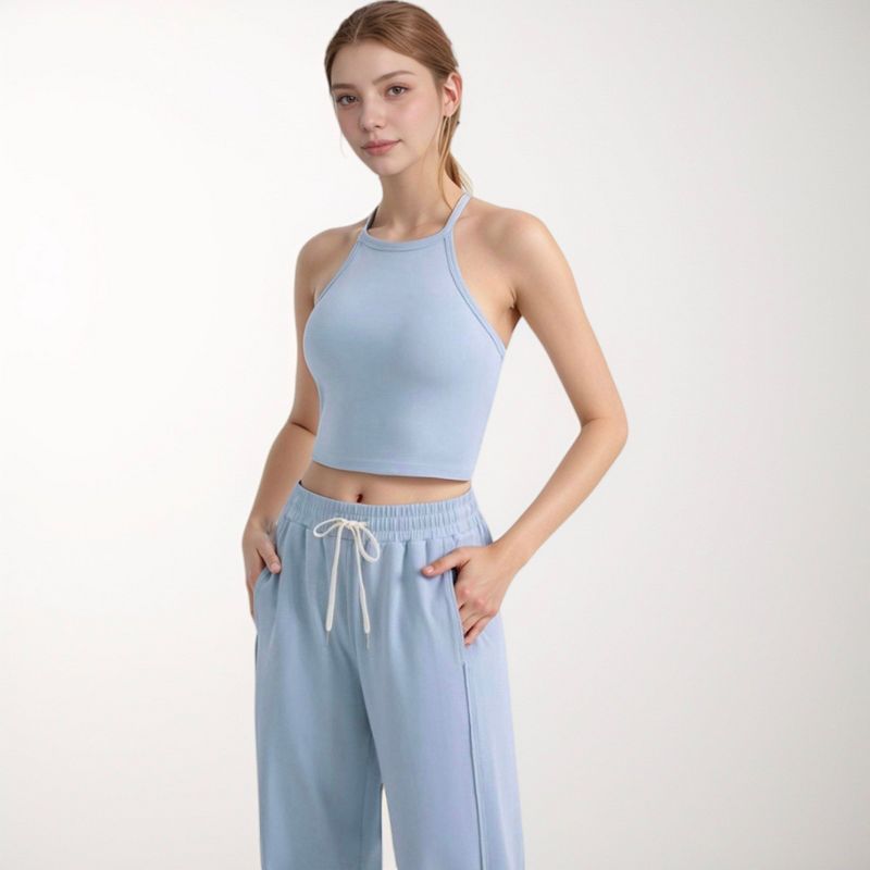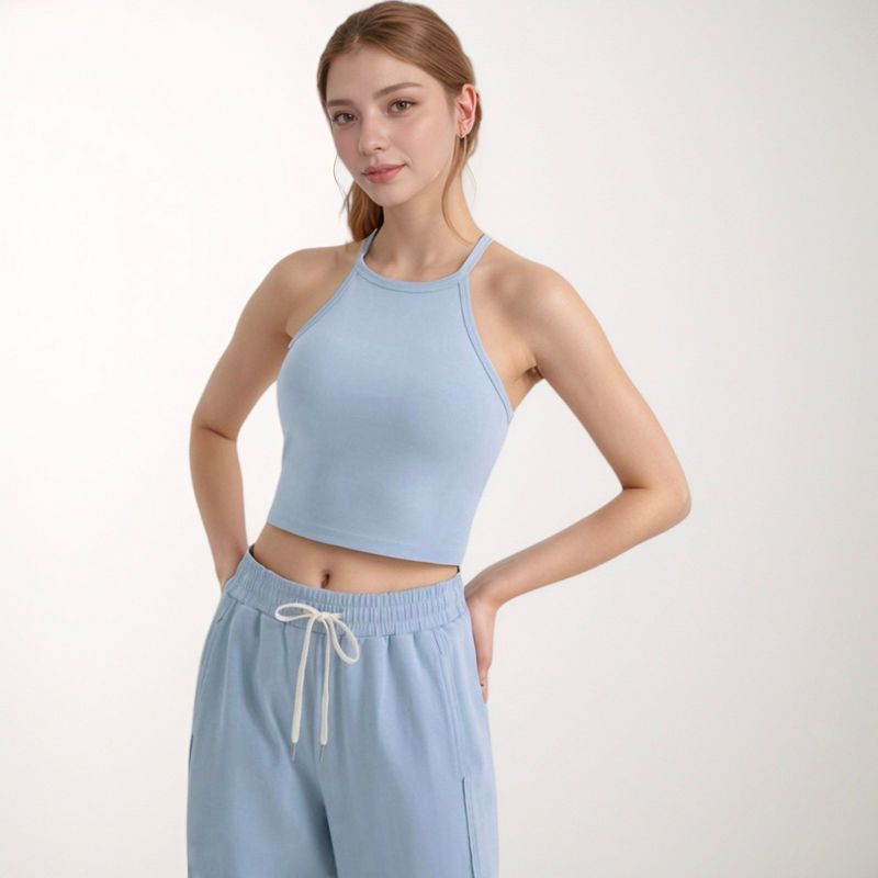 Anna-Kaci Active Women's High Neck Cropped Tank Top with Racer Style Straps and Seamless Fit for Active and Casual Wear - Large, Light Blue