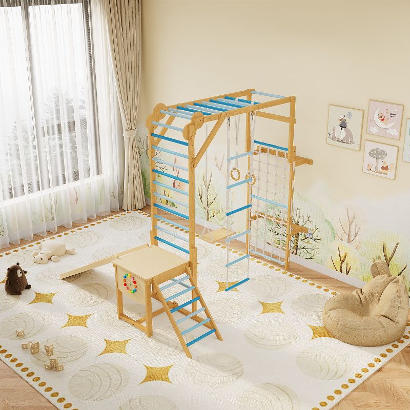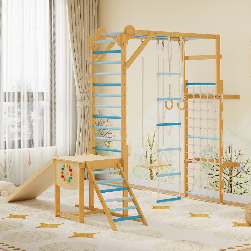 8-in-1 Indoor Jungle Gym Set with Slide Swing Monkey Bar Wooden Climbing Structure for Kids Ages 3-8