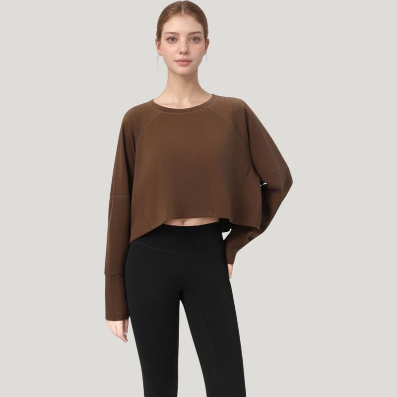 Anna-Kaci Active Women's Cropped Long Sleeve Active Top with Relaxed Fit and Crew Neck Design - Medium, Brown