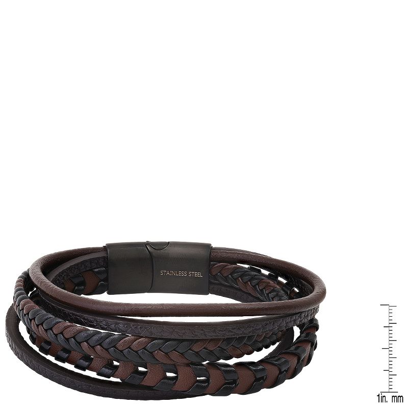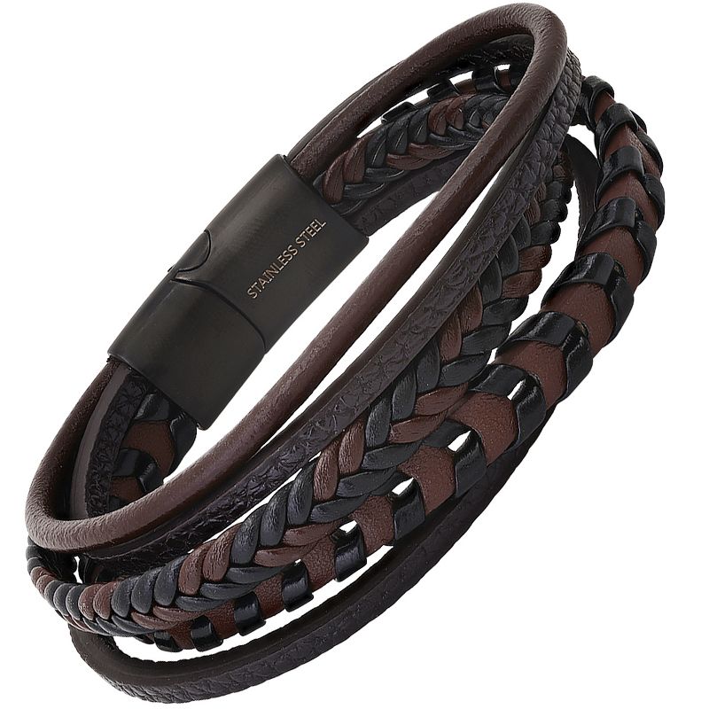 Steeltime Men's black & brown braided leather and black ip stainless steel magnetic layered bracelet